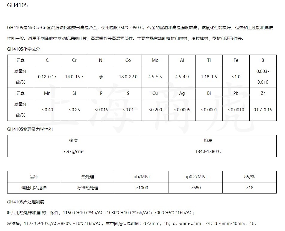 GH4105是Ni-Cr-Co基沉淀硬变化型变形高温合金,du使用750-950摄氏度。合金的室温和zhi高温强度较高,***化性能良dao好,但热加工性能和焊接性能一般。